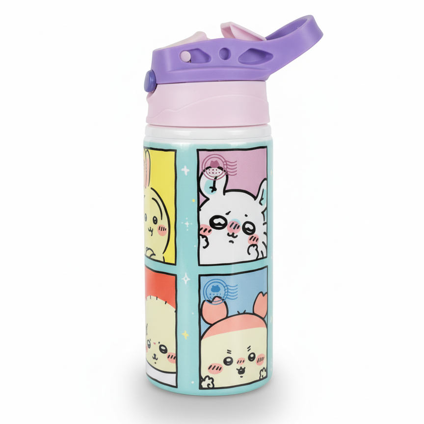 Mantén tu hidratación con ternura y estilo gracias a esta botella de agua inspirada en Chiikawa, decorada con diseños a todo color que capturan la dulzura y encanto de estos personajes. Con una capacidad aproximada de 500 cc, es perfecta para acompañarte en el día a día, ya sea en clases, trabajo o actividades al aire libre. Su diseño ligero y práctico convierte cada sorbo en un momento adorable, ideal para fans de la serie y amantes de los accesorios kawaii.
