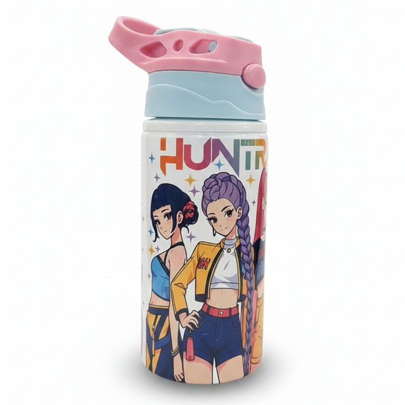 Esta botella de agua de aproximadamente 500 cc presenta un diseño vibrante inspirado en Las Guerreras de Kpop, ideal para quienes quieren llevar consigo la fuerza y encanto de las heroínasde Las Guerreras del Kpop. Perfecta para el día a día, te acompaña en clases, trabajo o entrenamiento, convirtiéndose en un accesorio práctico y llamativo que celebra tu amor por la serie.