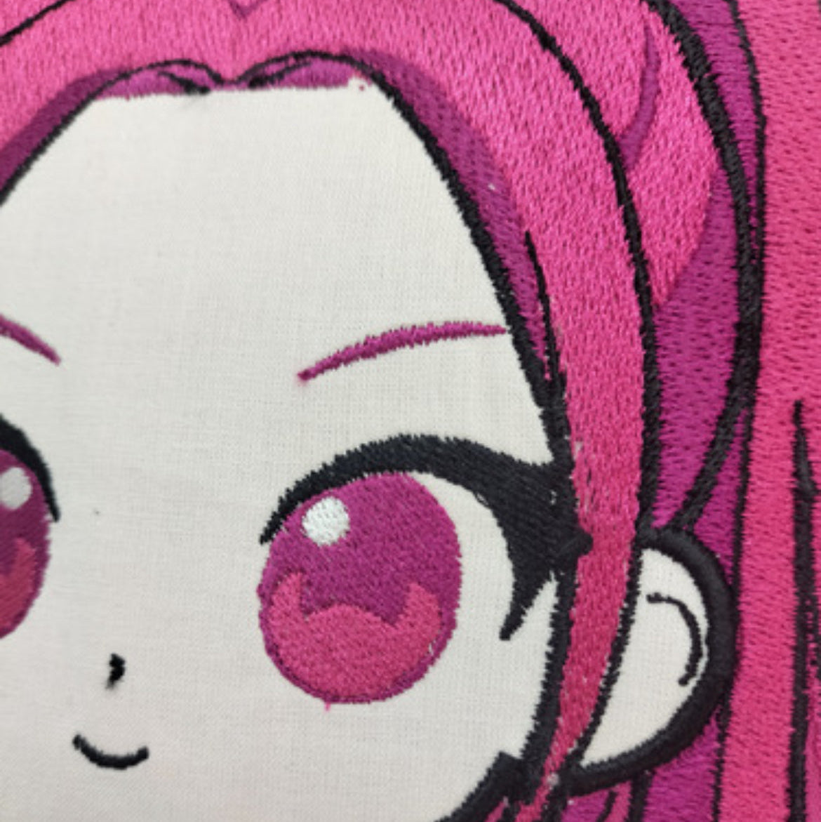 Diseño: bordado detallado del personaje Mira de Las Guerreras del K-Pop.