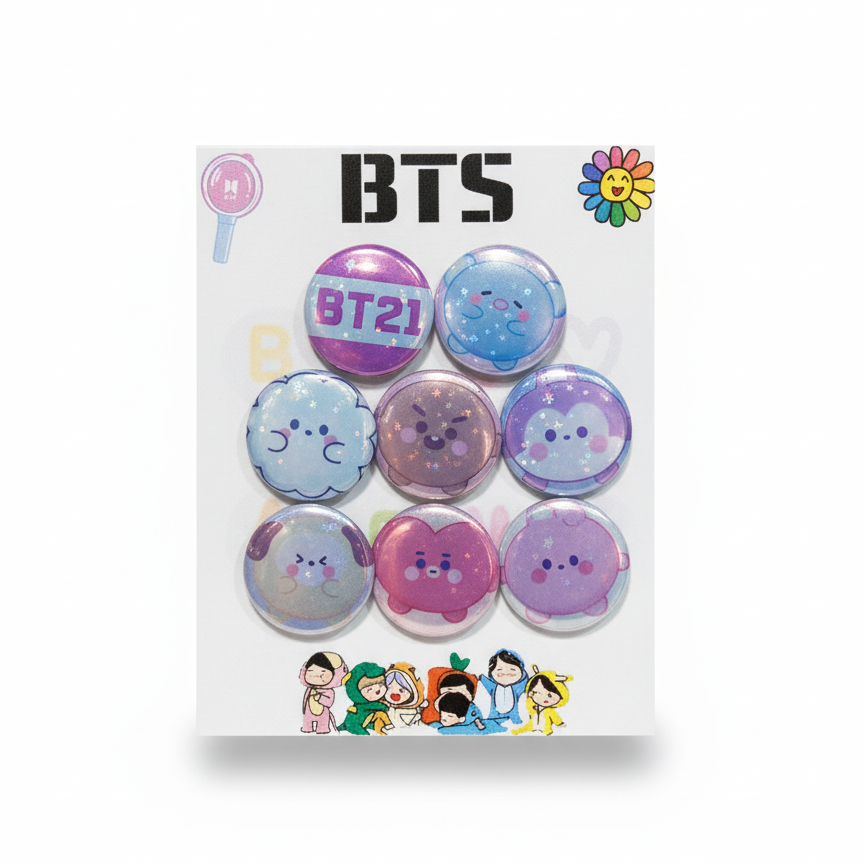 Muestra tu amor por la banda más famosa del K-pop con este set de 7 chapitas metalizadas de BTS, un accesorio imprescindible para fans que desean llevar a sus ídolos siempre consigo. Cada chapita refleja el estilo único y la energía de los integrantes, perfectas para personalizar mochilas, chaquetas o colecciones. Su diseño vibrante y duradero las convierte en un detalle especial que no solo adorna, sino que también celebra tu pasión por la música y el carisma de BTS.